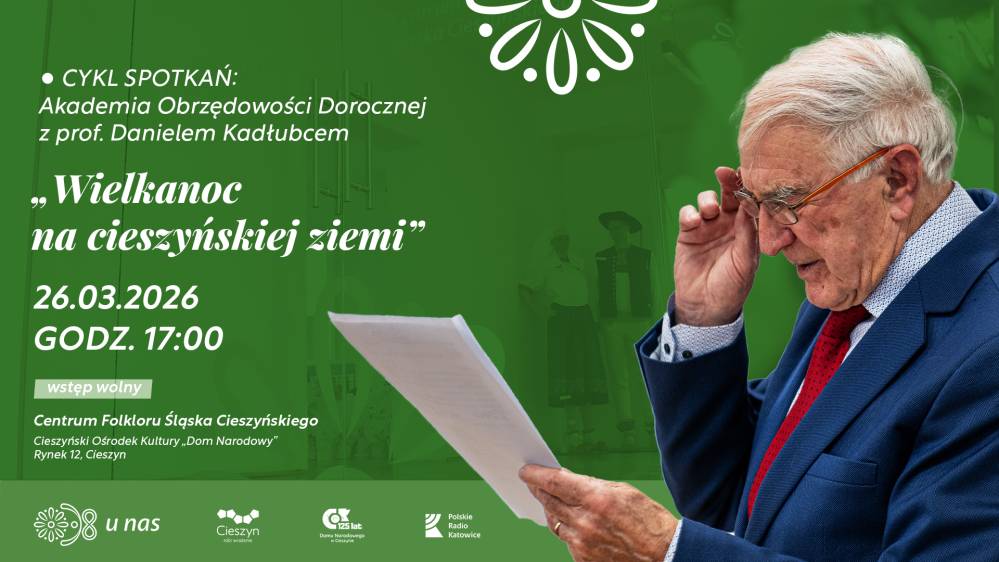 W czwartek 26 marca 2026 r. o godzinie 17:00 w Centrum Folkloru Śląska Cieszyńskiego, na drugim piętrze Domu Narodowego w Cieszynie odbędzie się spotkanie pt. "Wielkanoc na cieszyńskiej ziemi", podczas którego odkrywać będziemy wspólnie kolejny wycinek bogactwa tradycji Śląska Cieszyńskiego, związany z obchodami Wielkanocy.
