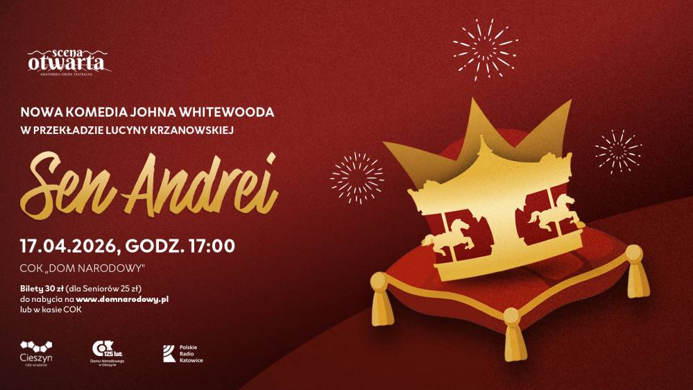 Zapraszamy na najnowszy spektakl Johna Whitewooda "Sen Andrei", w wykonaniu Grupy Teatralnej "Scena Otwarta". Wydarzenie odbędzie się w piątek 17 kwietnia 2026 r. o godzinie 17:00, w sali widowiskowej Cieszyńskiego Ośrodka Kultury "Dom Narodowy".